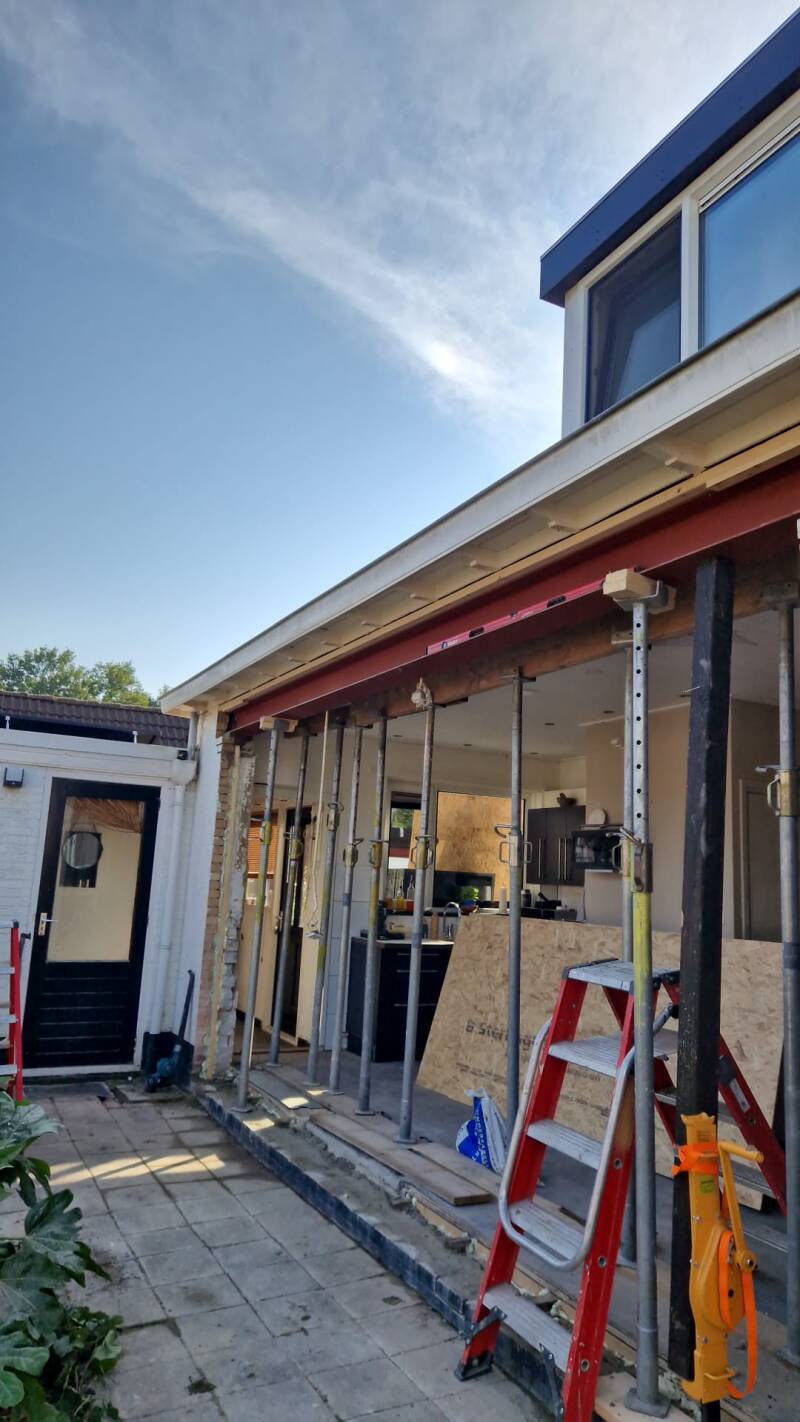 De achtergevel hebben we eruit gehad en een draagbalk geplaatst. De pui is gezet met een kraan. Deze familie heeft nu een hele mooi glazen achtergevel waarvan de pui beide kanten open kan. Veel plezier met deze prachtige pui
