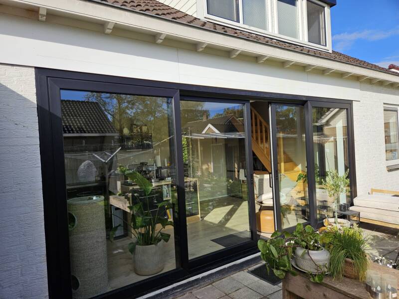 Aan de achterkant van deze woning hebben we een grote kunstof schuifpui geplaatst. Zwart van binnen en zwart van buiten van kleur.