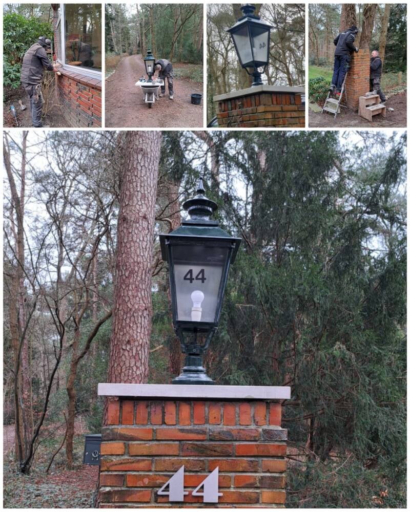 Voor deze klant mochten we eerder al wat klussen doen. Deze keer waren het een paar raamdorpelstenen vervangen die stuk waren. En nieuwe lantaarns plaatsen boven op de pilaren. Samen met lefferts techniek deze klus in samenspraak kunnen afmaken. Zodat ze gelijk aangesloten zijn. Deze familie kan weer de oprit opdraaien met mooie verlichting.